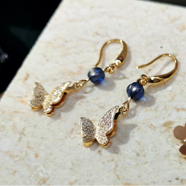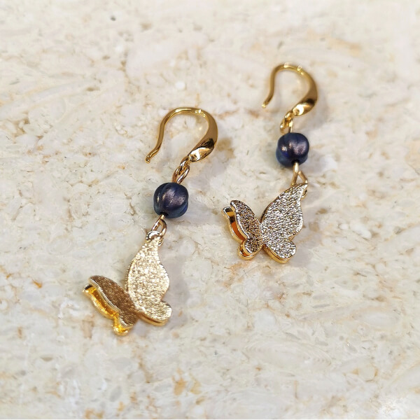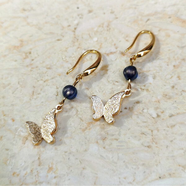 A pair of 18k gold-plated earrings. Butterflies has two layers of wings with the top layer beautifully frosted. Accented with blue glass beads with gold shimmer. Length measures 4 cm. (Kindly allow 2-3mm difference and slight imperfection as each piece is individually handcrafted.)