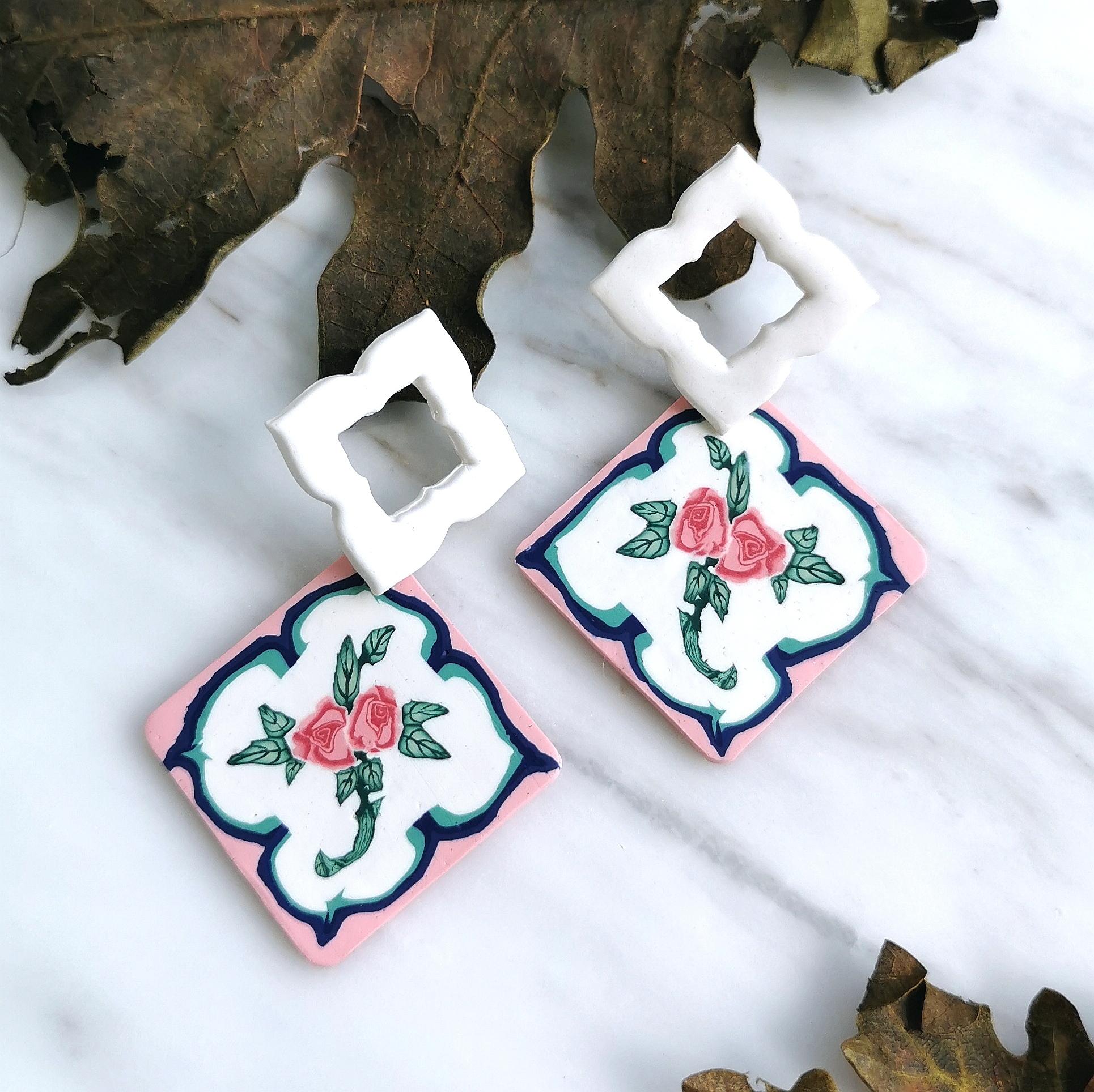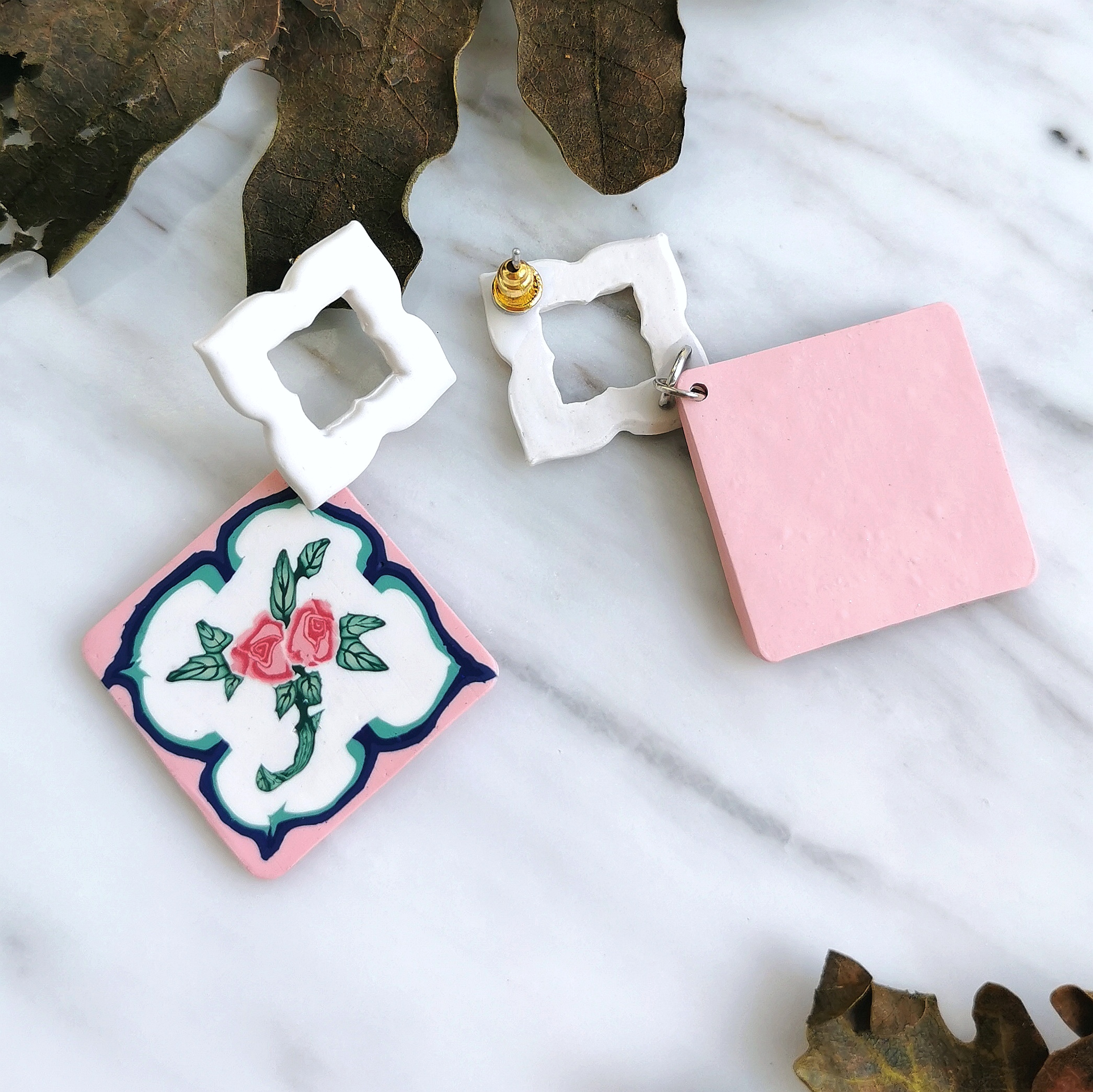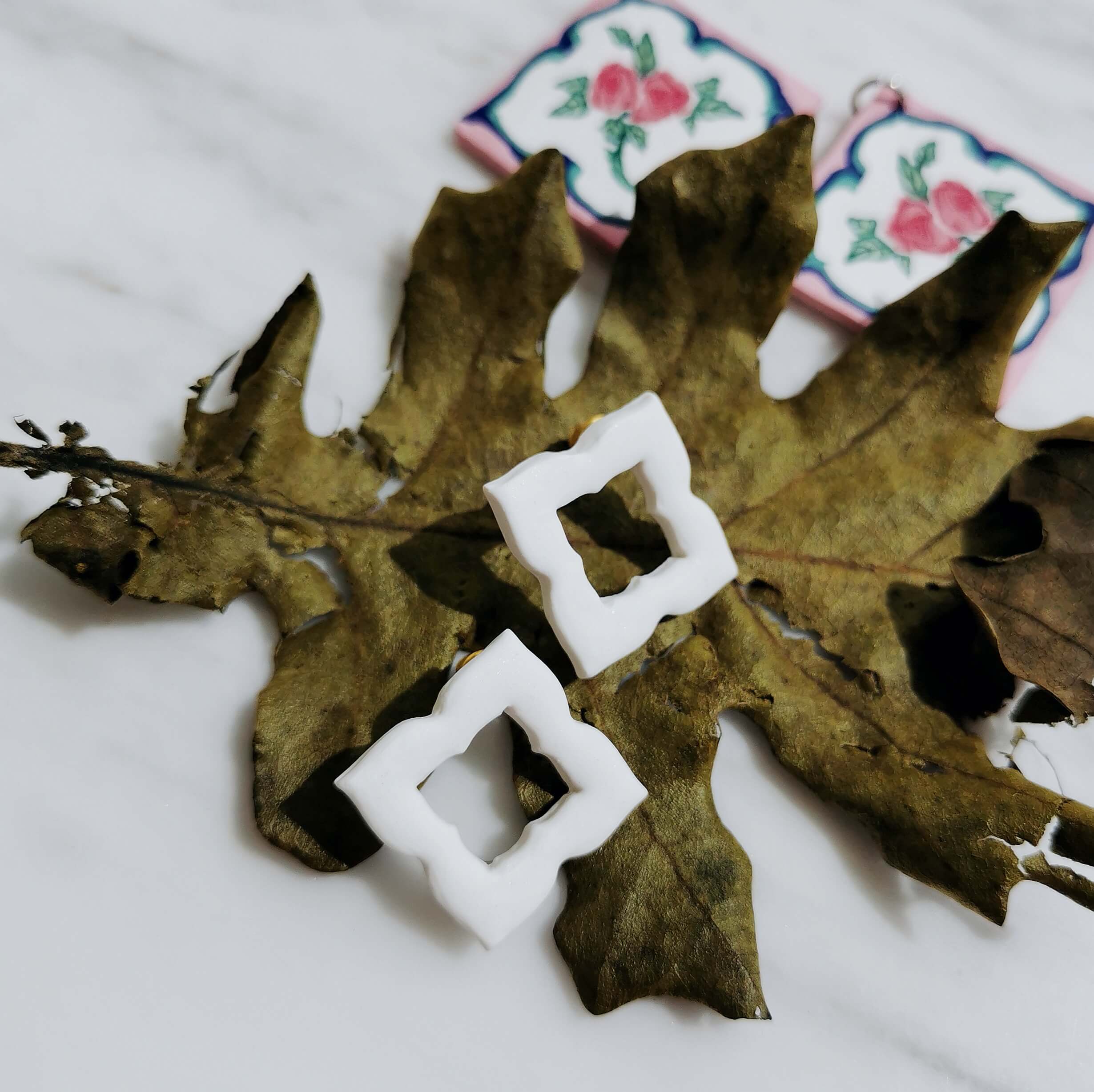 A pair of elegant earrings inspired by traditional rose tiles. Could be worn with only the top white studs after detaching the bottom tiles. Single-sided motif. Extremely lightweight. Total length measures 5.9 cm. Top white piece measures 1.8cm on the side, bottom tile measures 2.8cm on the side. (Kindly allow 2-3mm difference and slight imperfection as each piece is individually handcrafted.)