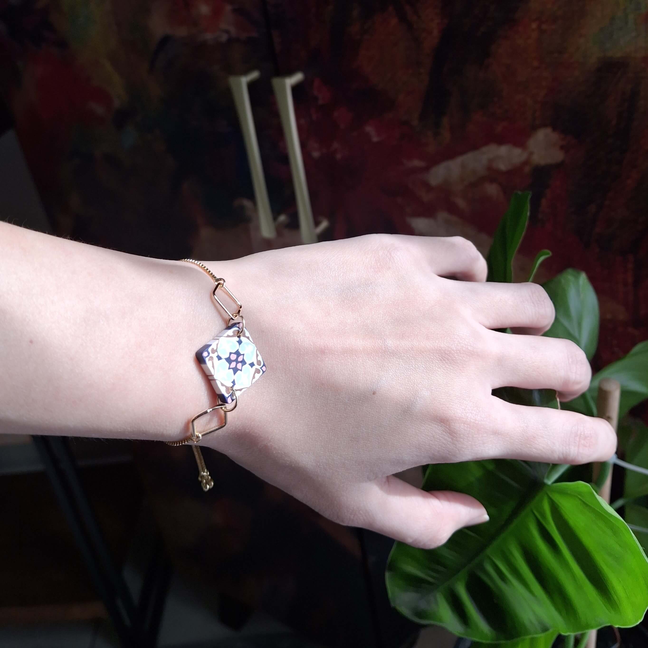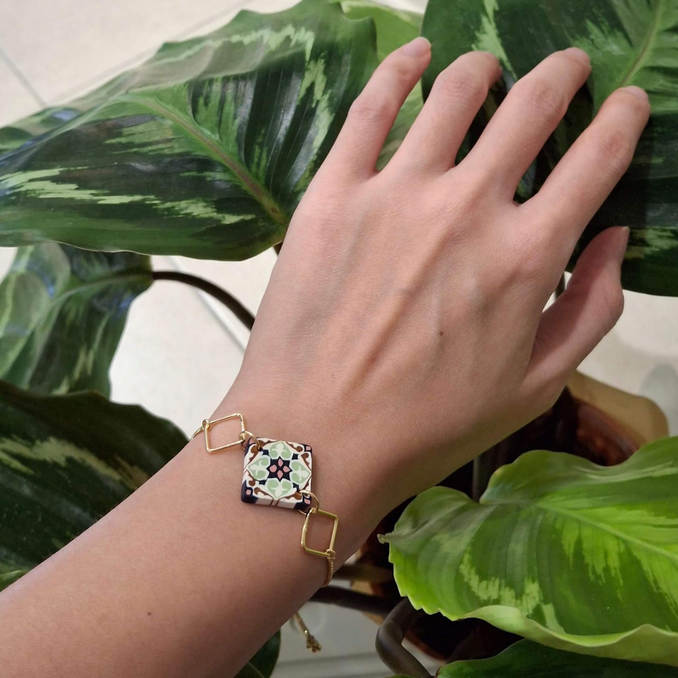 This bracelet blends history and elegance in the most perfect manner. Made to fit everyone, this is an adjustable bracelet with double-sided tile (approx. 1.6cm), flanked by two 18k gold-plated square charms (1cm), which will elevate your outfit from day to night. (Kindly allow slight imperfection as each piece is individually handcrafted.)