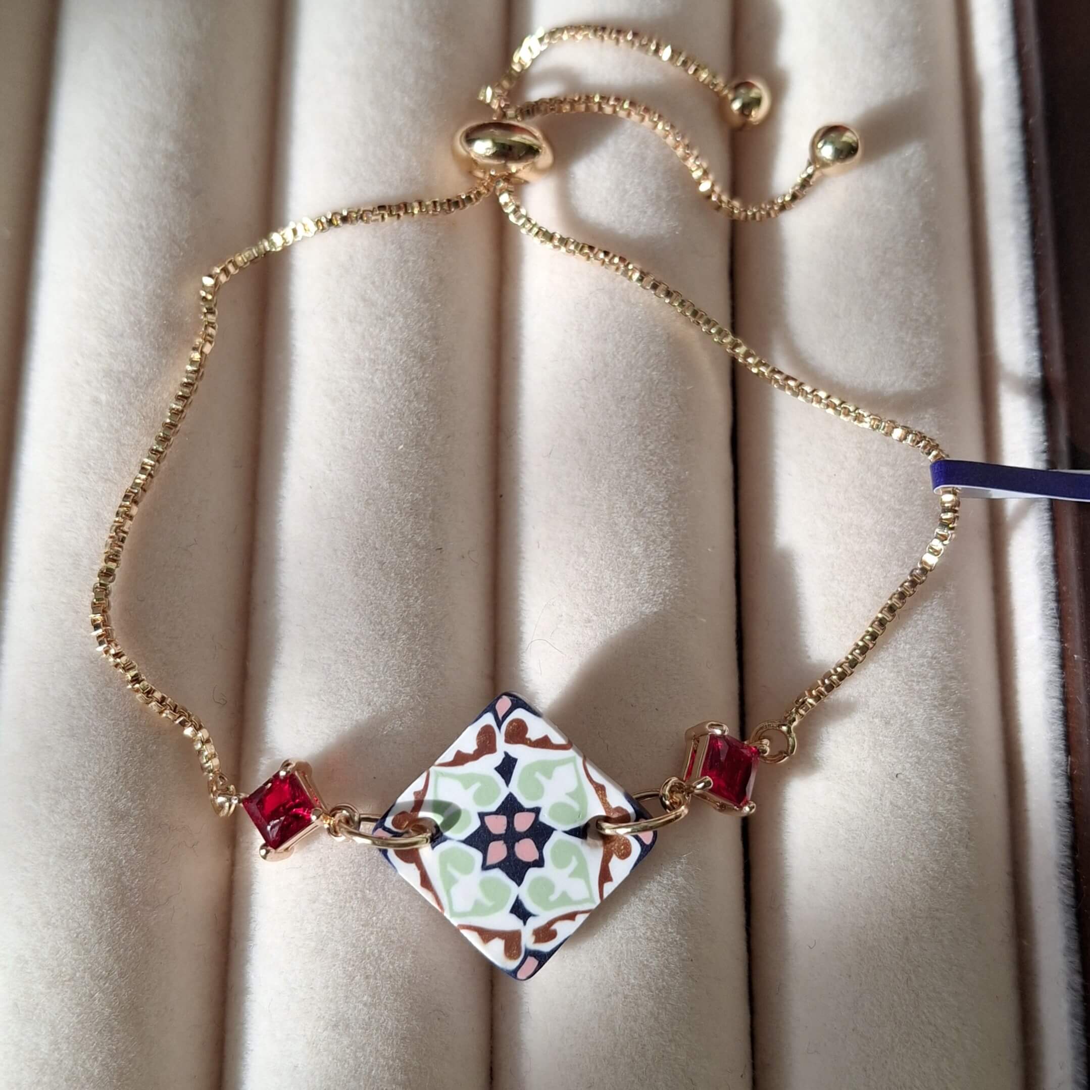 A trendy 18k gold-plated adjustable bracelet, adorned with handmade Peranakan tile with double-sided motif. Tile measures approximately 1.3cm, red gem measures 6mm. One size fits all. (Kindly allow 2-3mm difference and slight imperfection as each piece is individually handcrafted.)