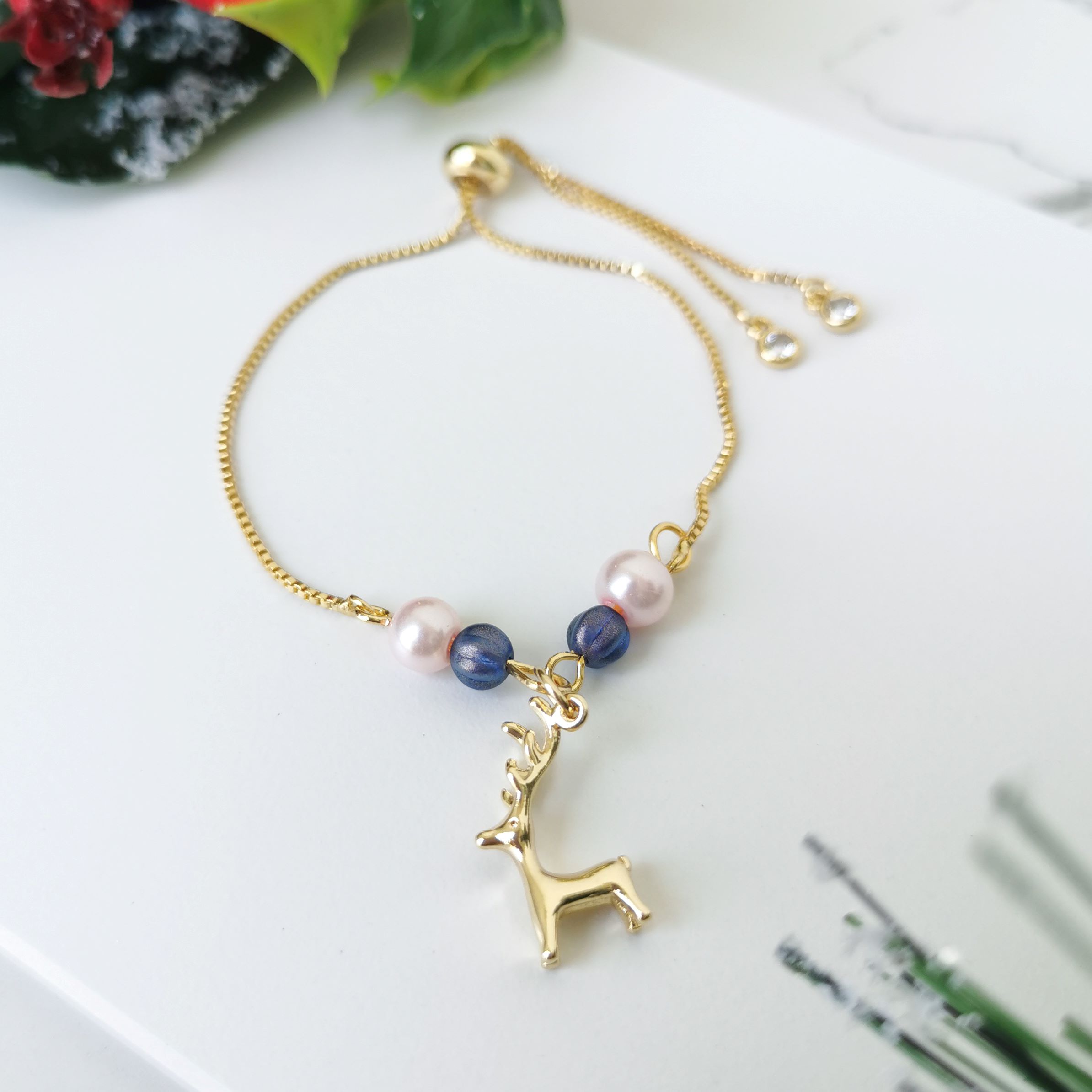 A handmade reindeer bracelet adorned with blue Czech glass beads that flaunt a hint of gold shimmer, perfect for the Christmas season. The adjustable fastening makes it suitable for all sizes.